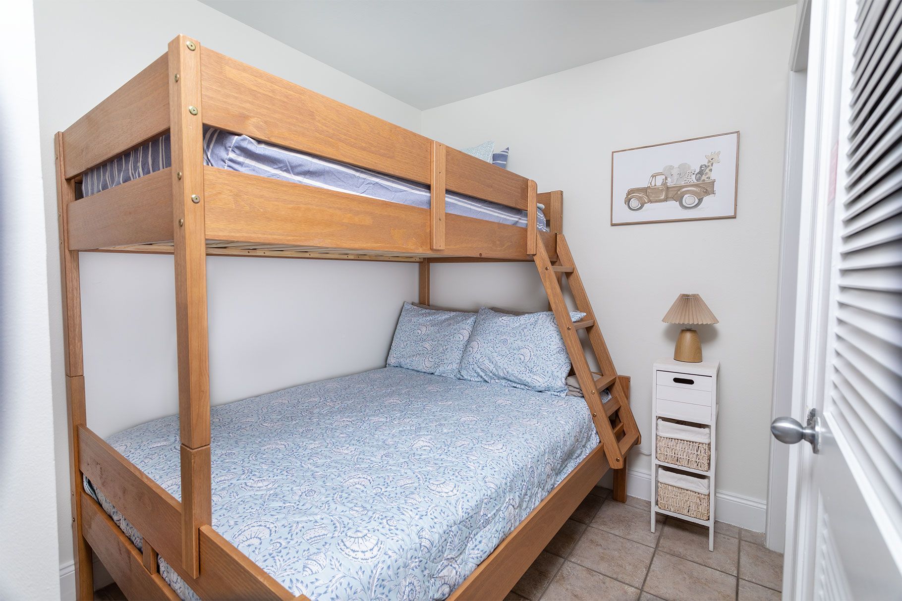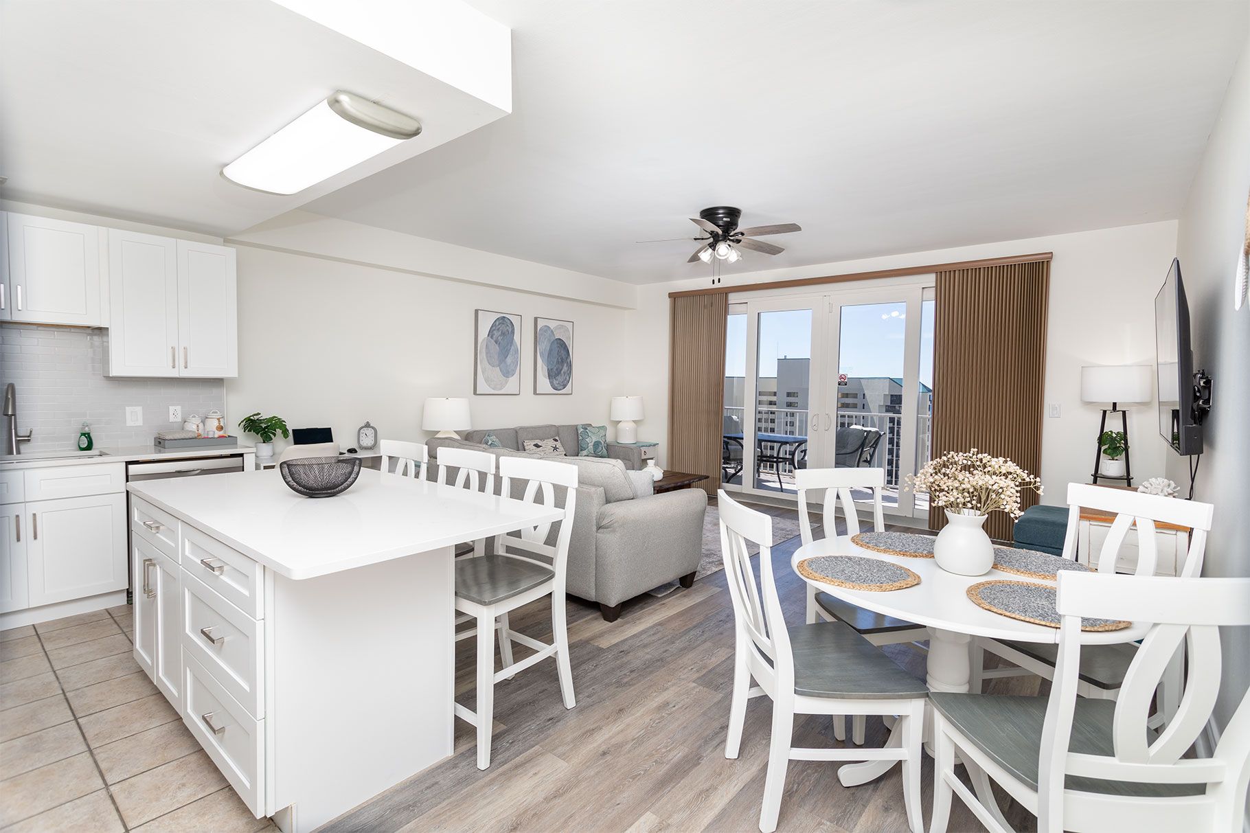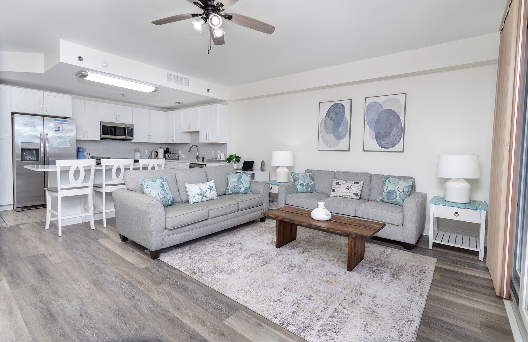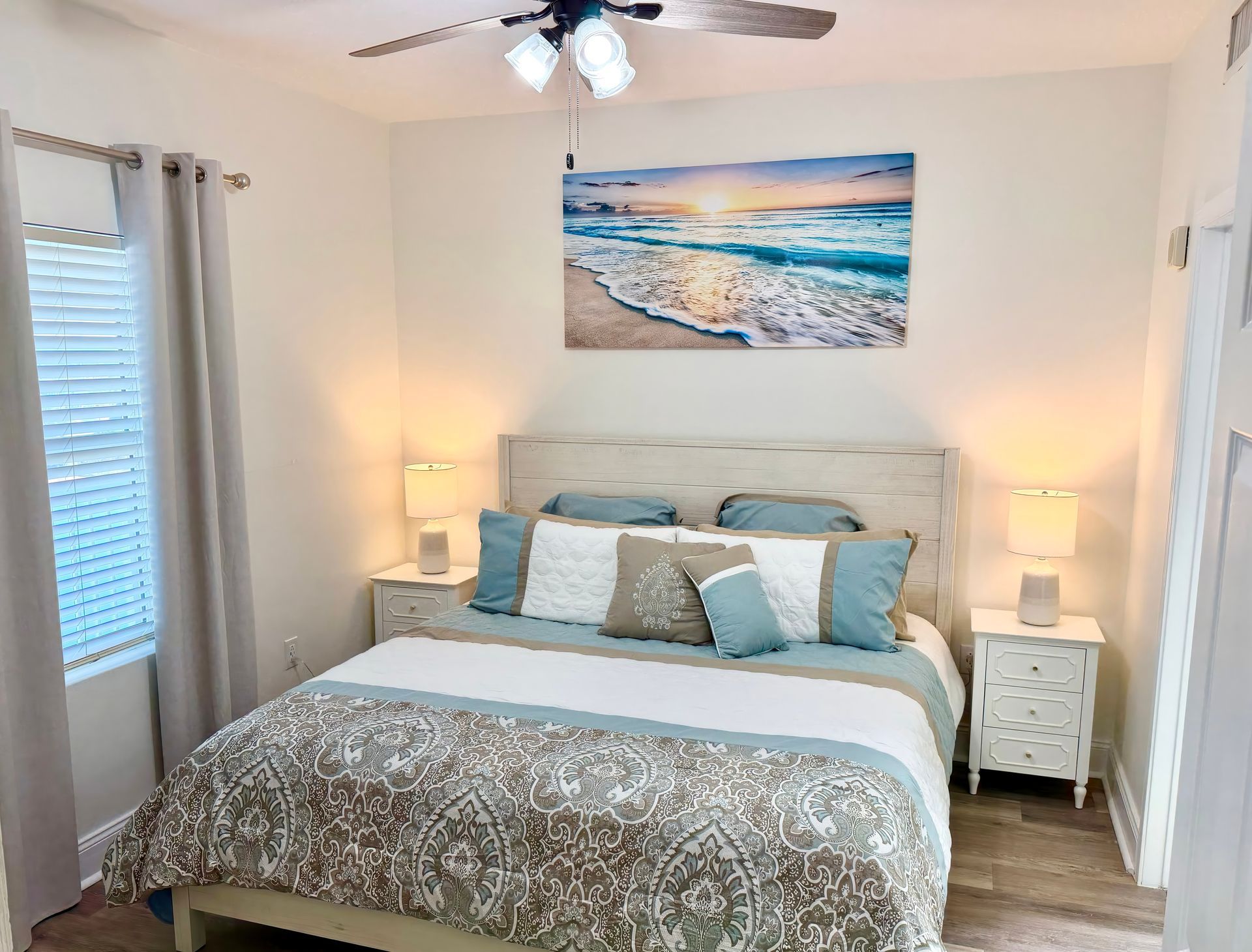 The spacious master suite includes a king bed, and the second bedroom offers a twin-over-full bunk bed. A comfortable queen sofa sleeper in the living room allows the condo to sleep up to 7 guests.