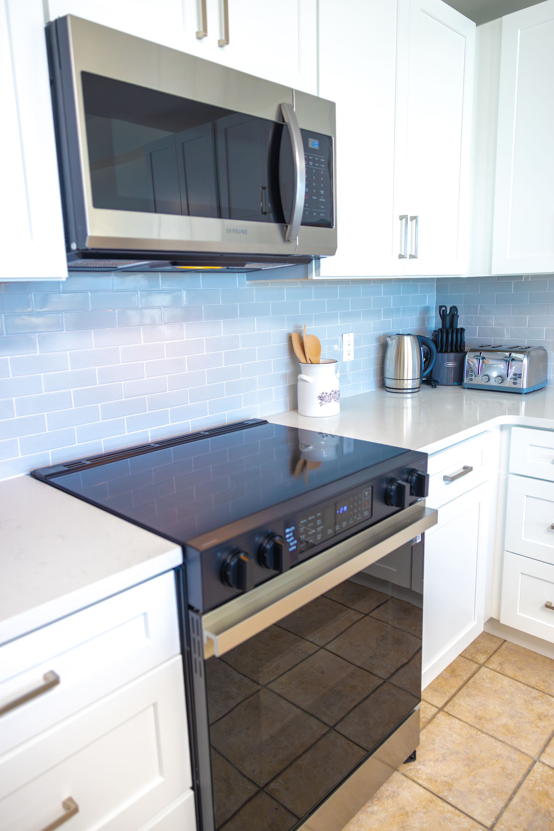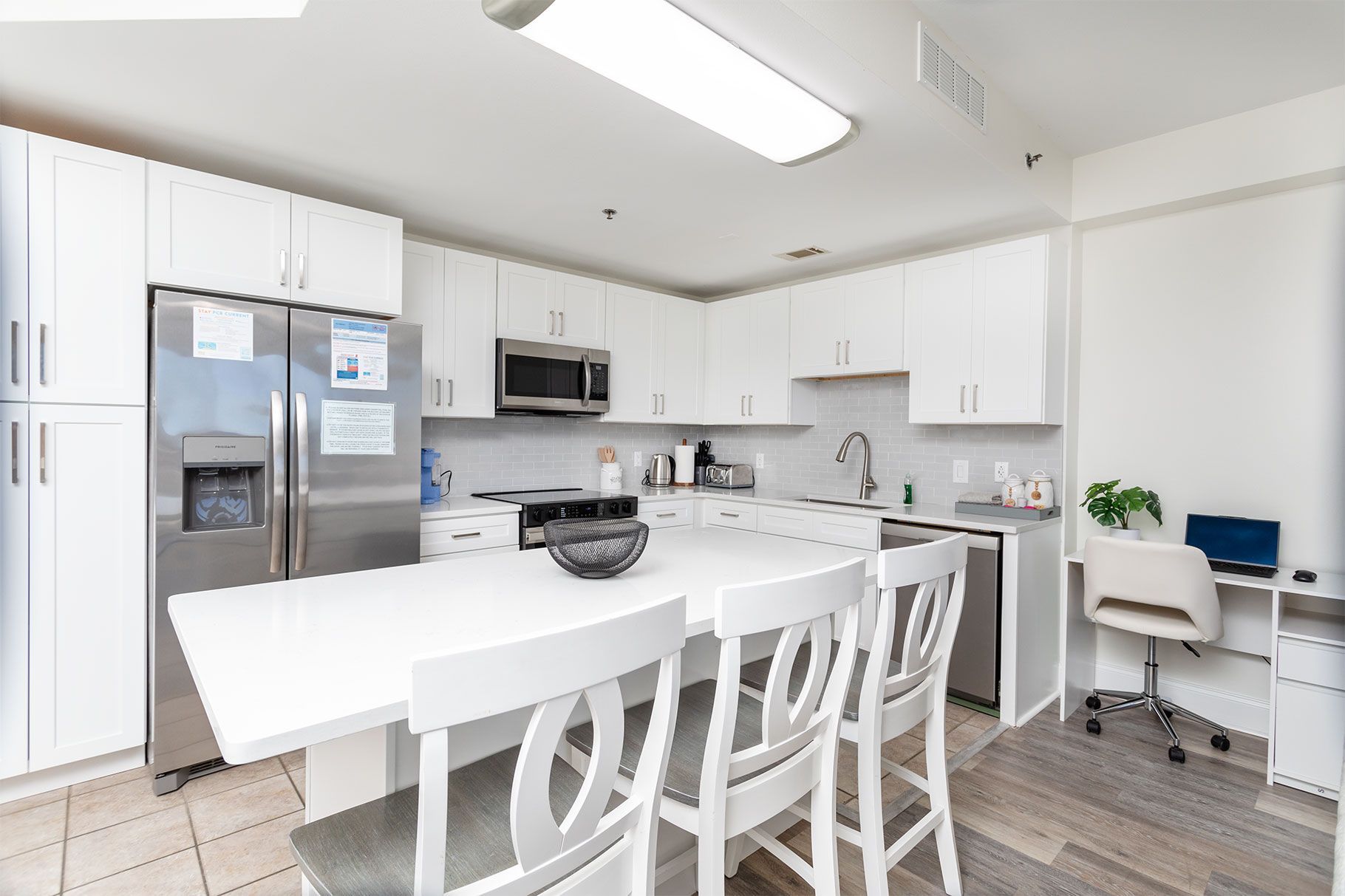 The open-concept living space features a 75” Smart TV, seamlessly integrated with a full kitchen with stainless steel appliances. Perfect for family gatherings and holidays.