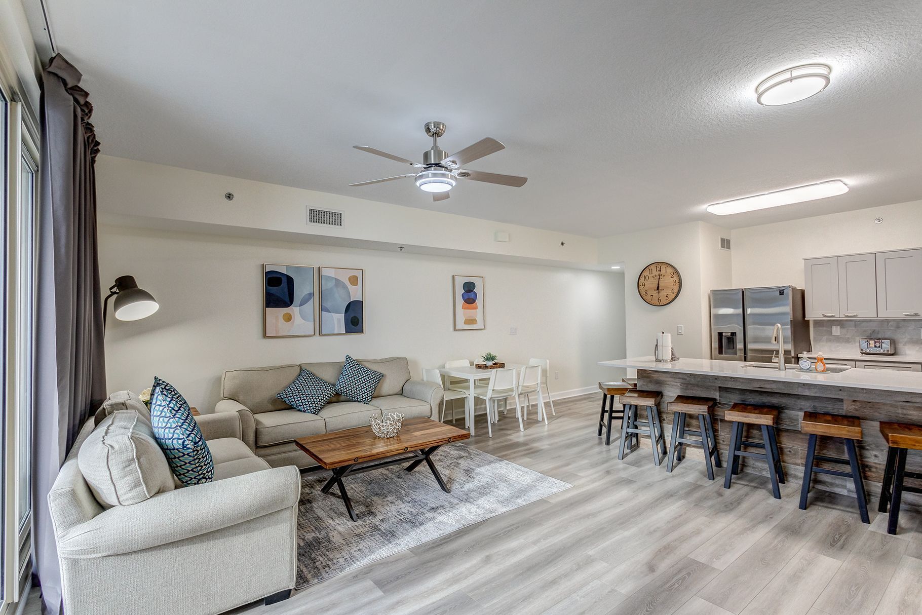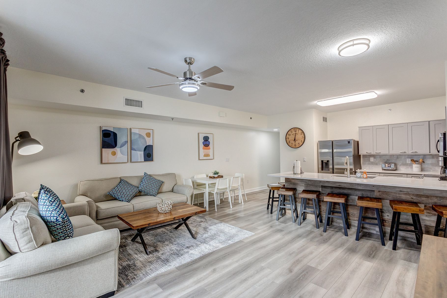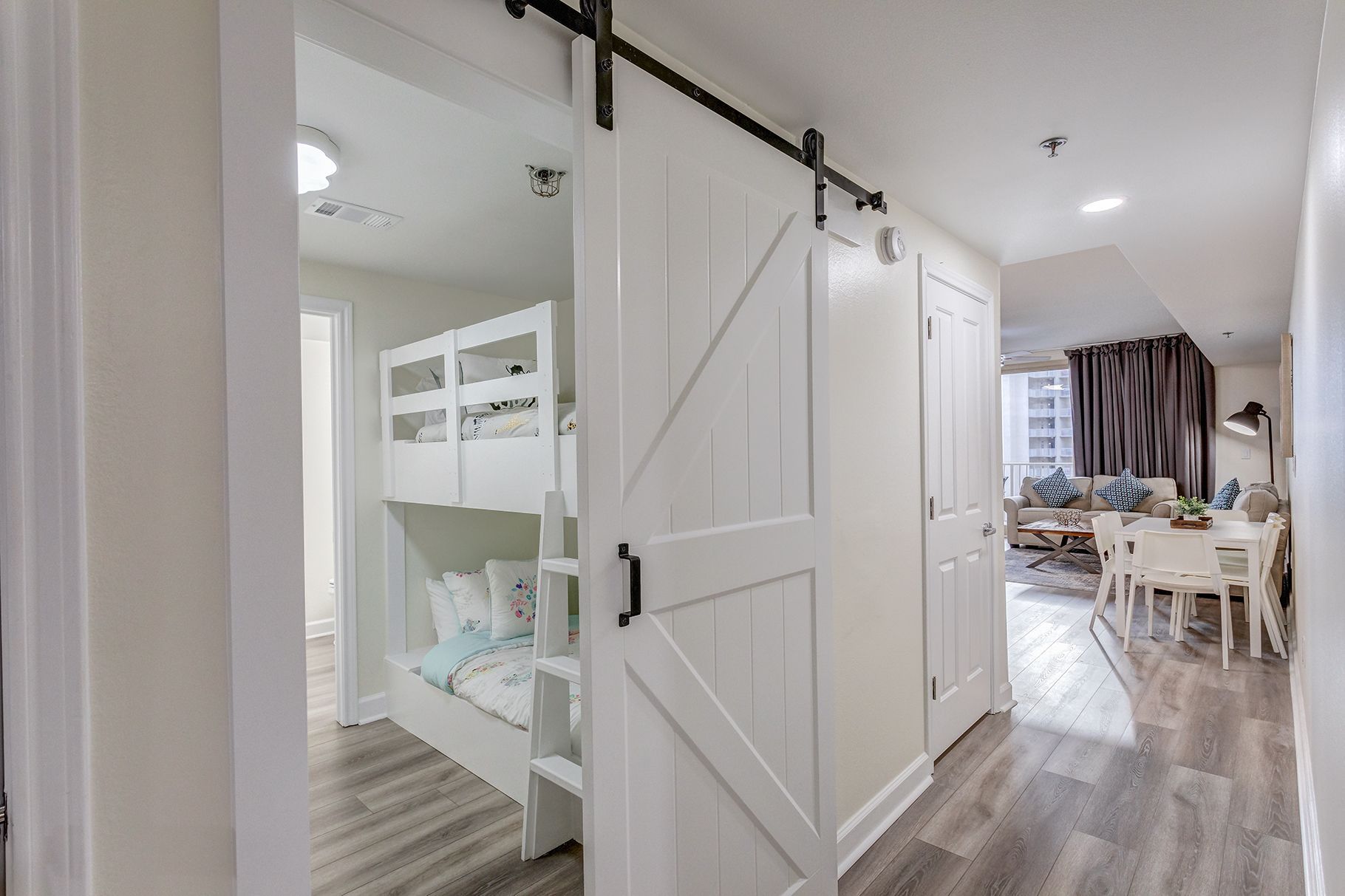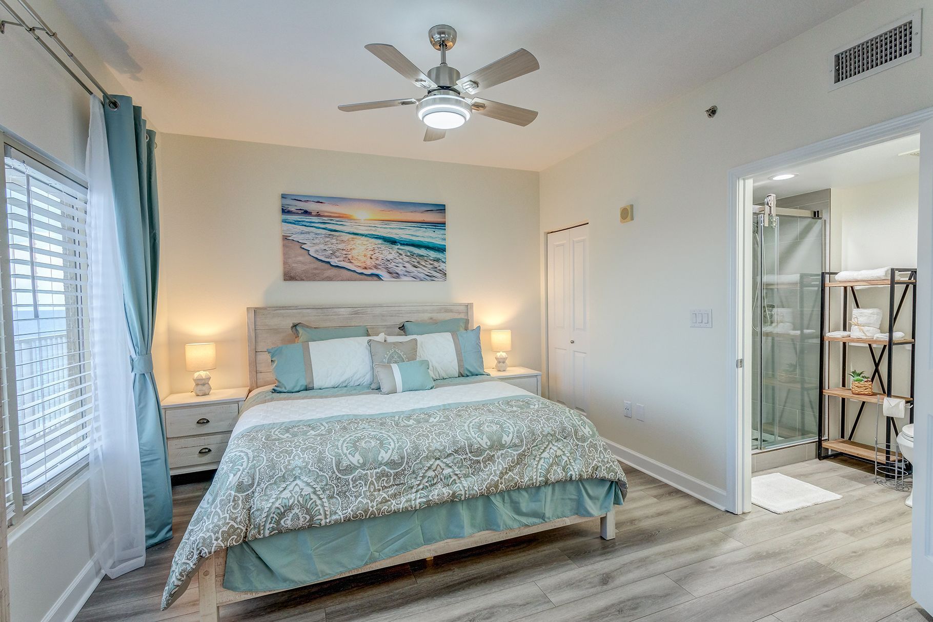 The spacious master suite includes a king bed and a dedicated workspace, while the second bedroom offers a queen bed with Gulf views and a private bathroom. A custom twin bunk room and a comfortable sofa sleeper allow the condo to sleep up to 9 guests.