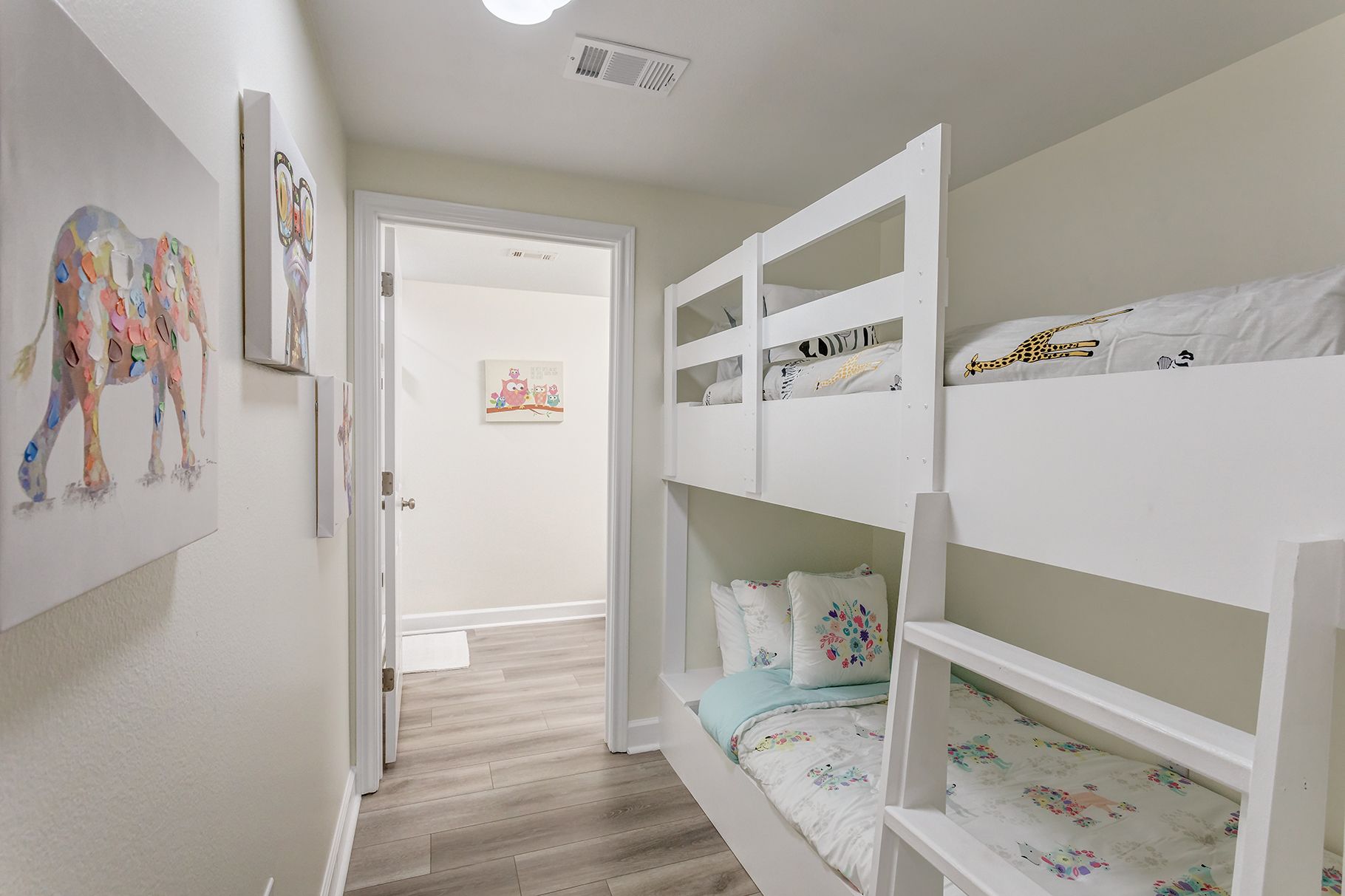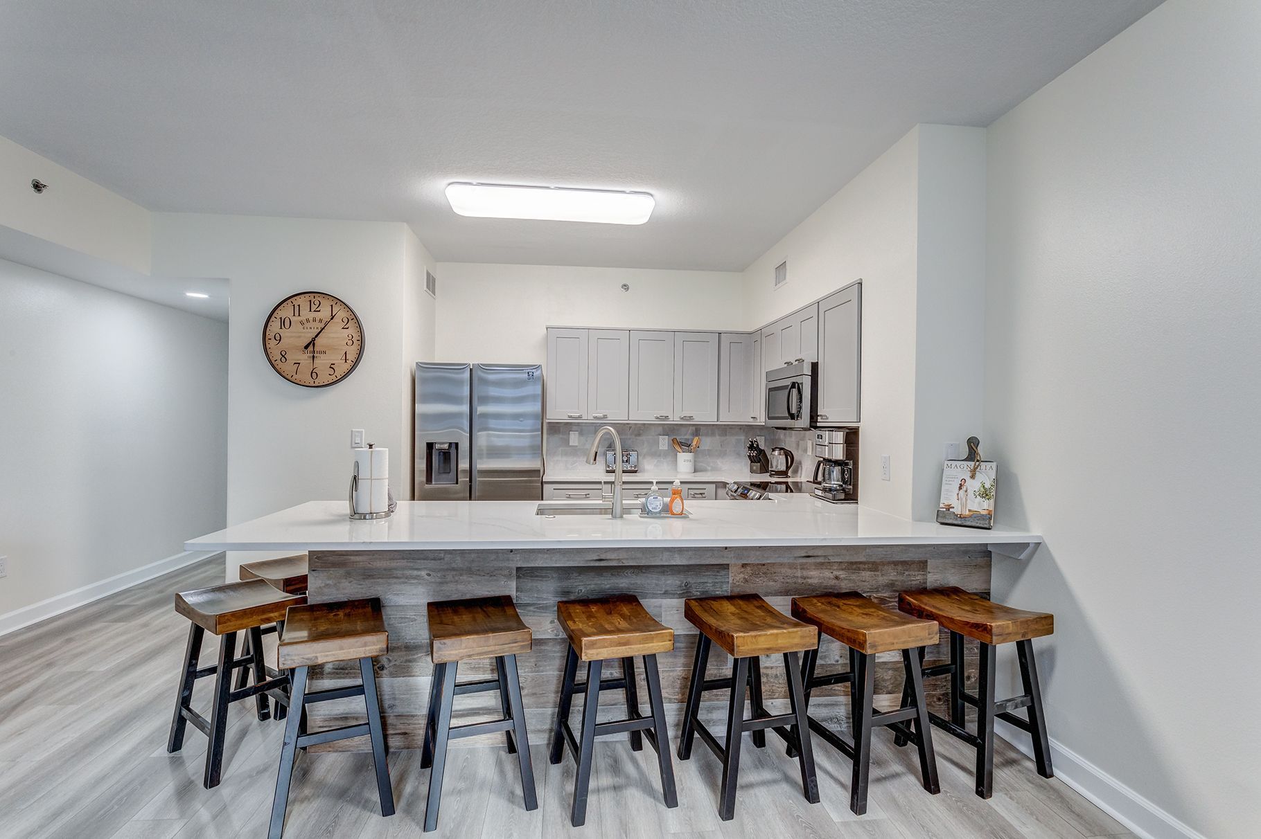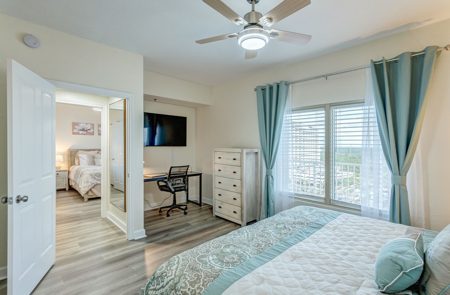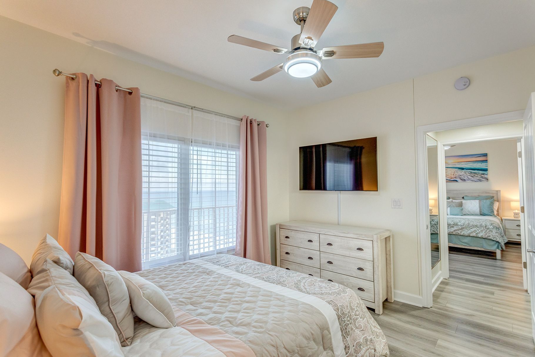The spacious master suite includes a king bed and a dedicated workspace, while the second bedroom offers a queen bed with Gulf views and a private bathroom. A custom twin bunk room and a comfortable sofa sleeper allow the condo to sleep up to 9 guests.
