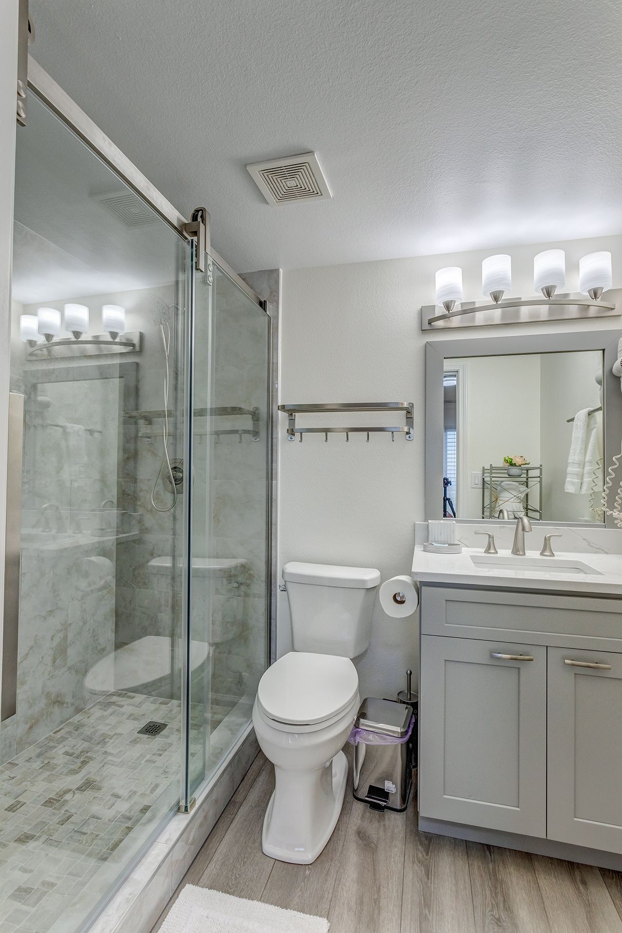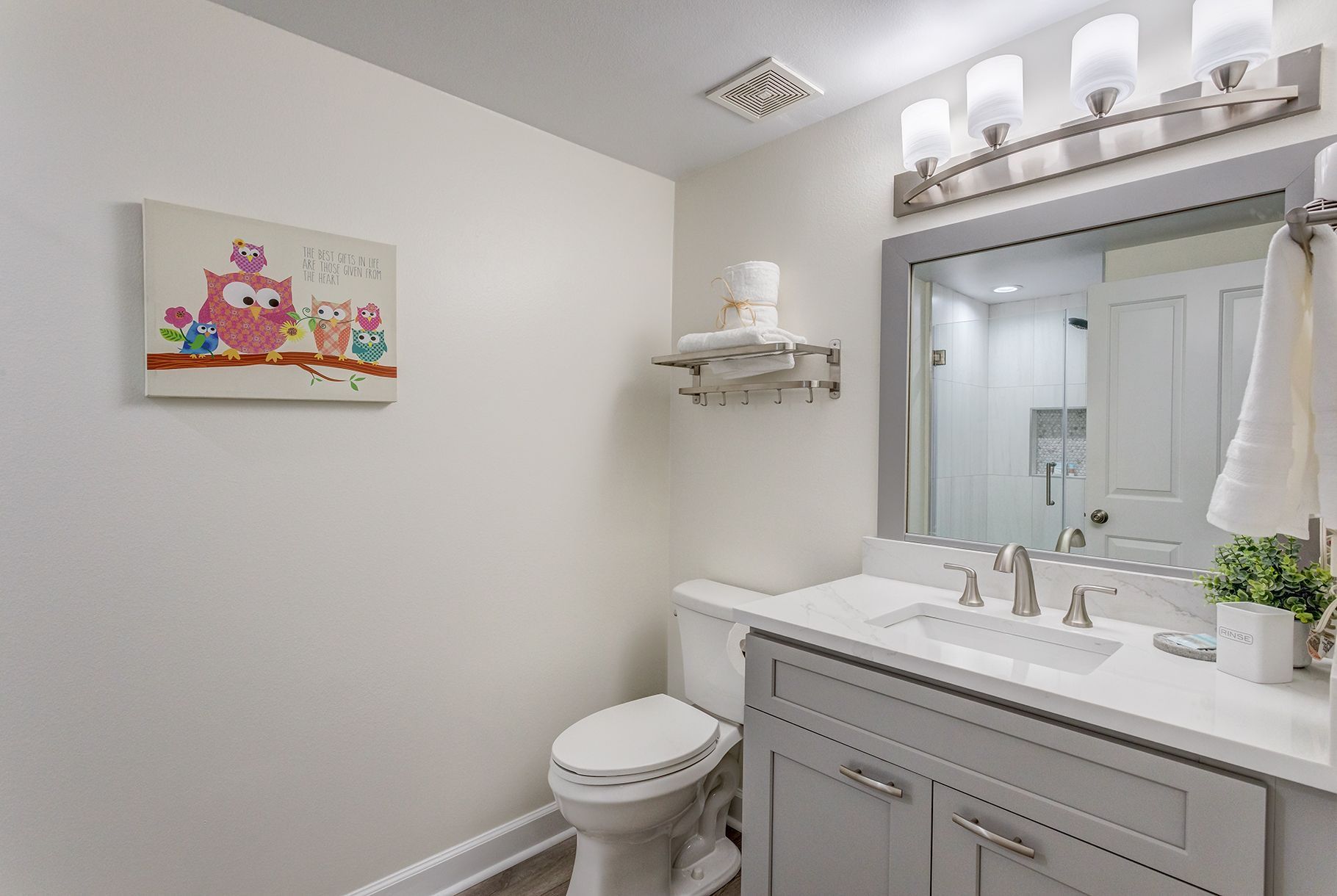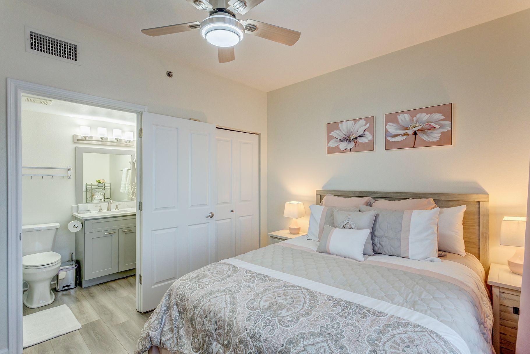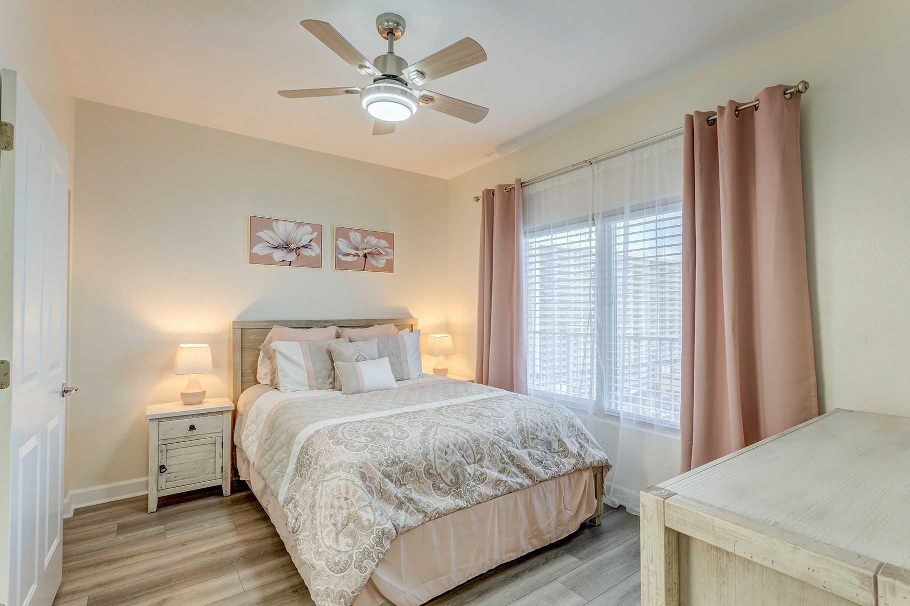 The spacious master suite includes a king bed and a dedicated workspace, while the second bedroom offers a queen bed with Gulf views and a private bathroom. A custom twin bunk room and a comfortable sofa sleeper allow the condo to sleep up to 9 guests.