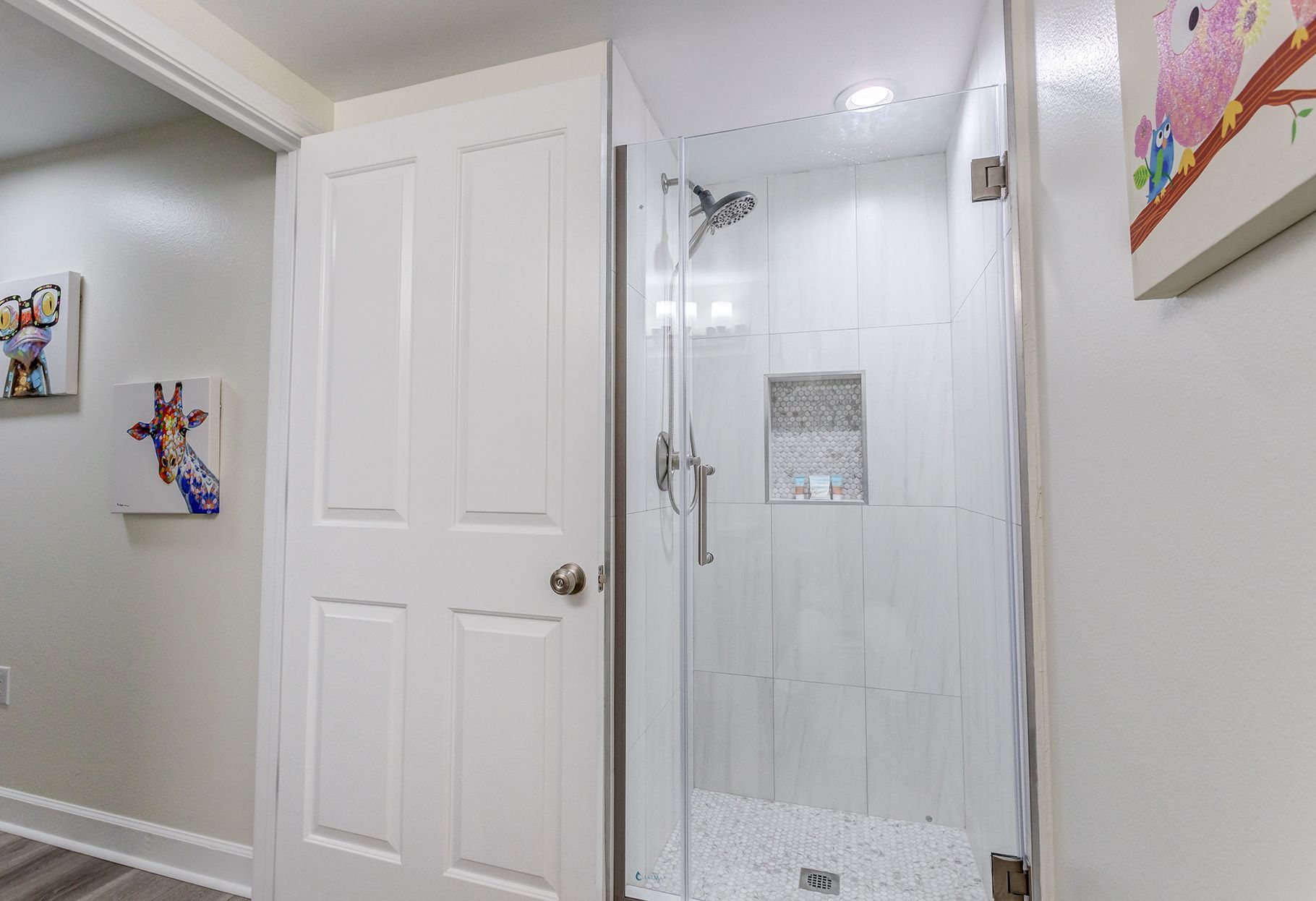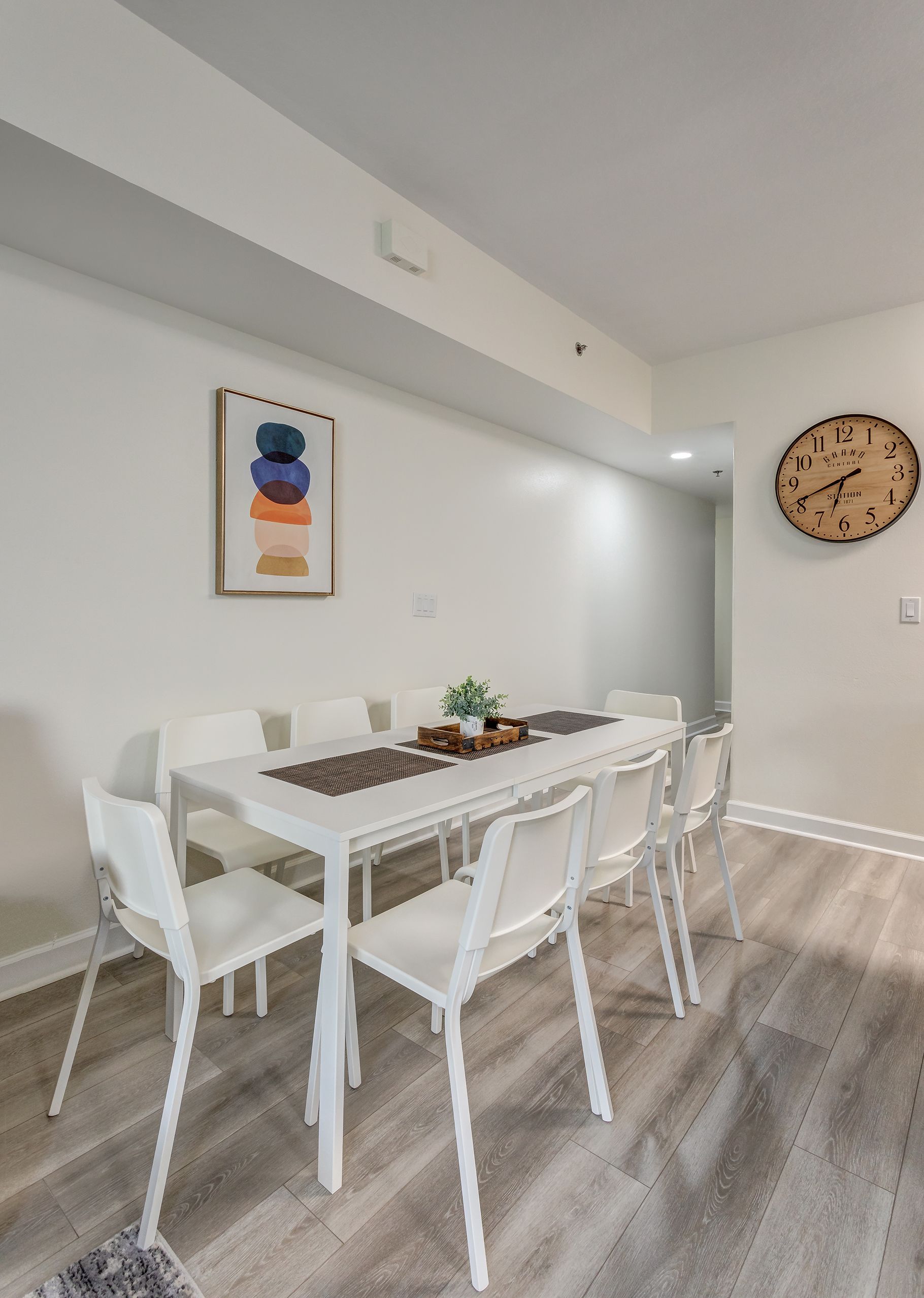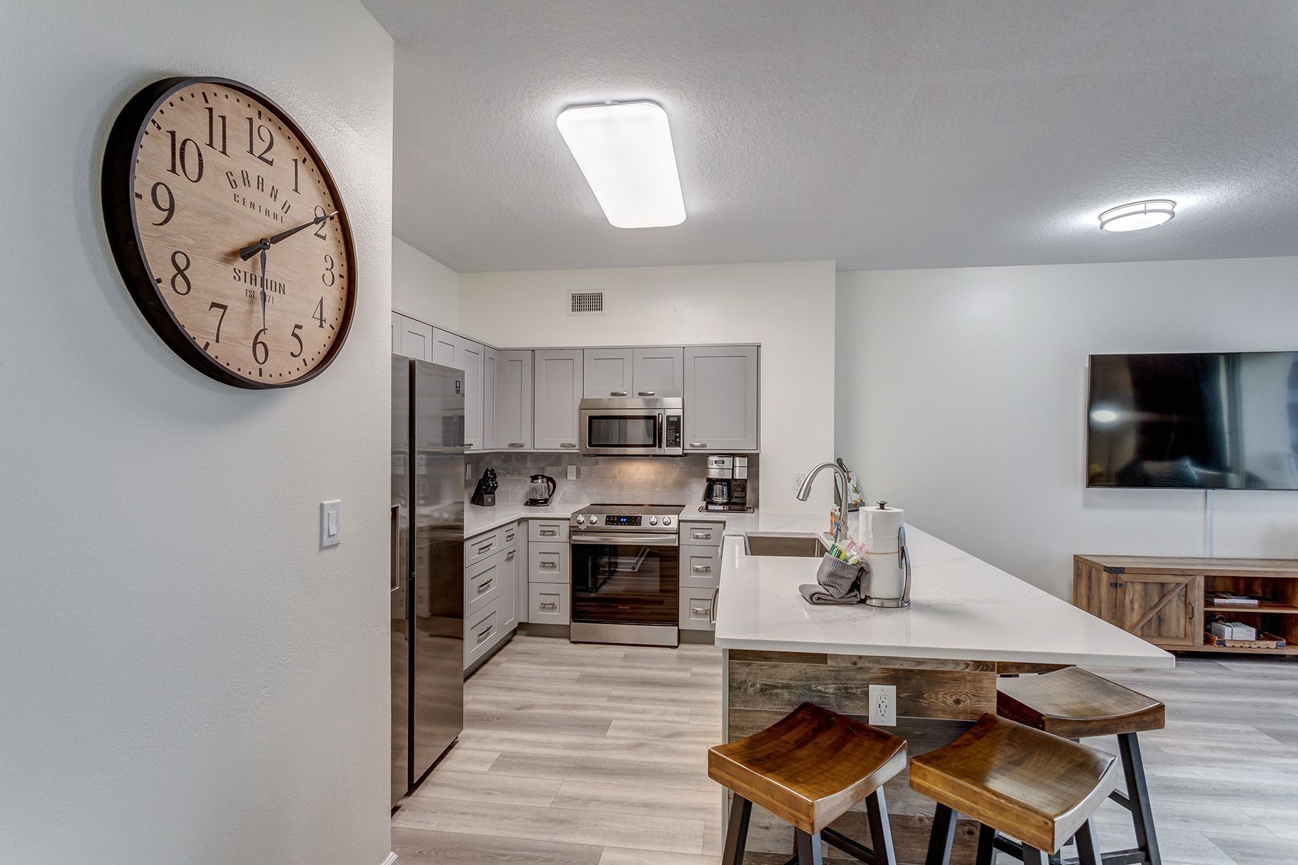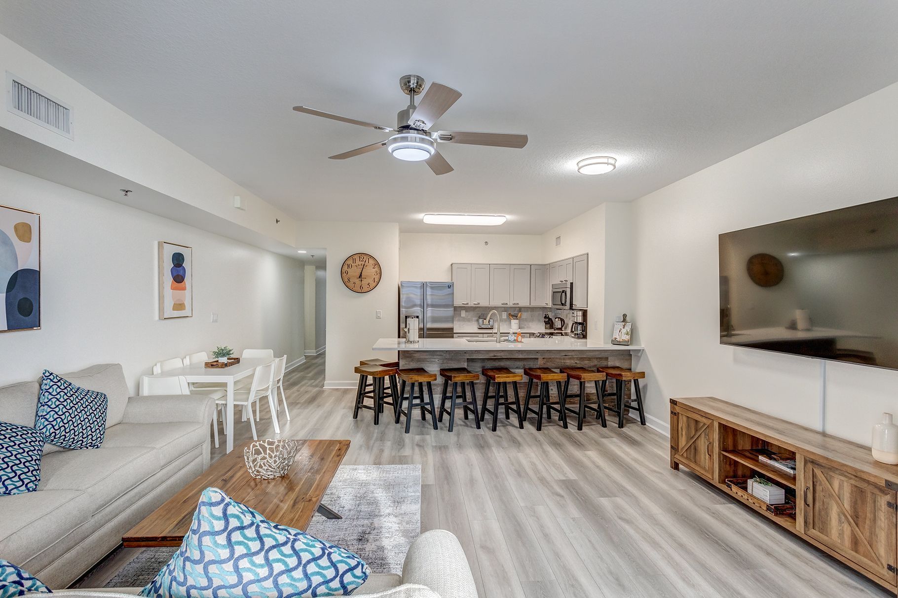 The open-concept living space features a 75” Smart TV, an oversized kitchen island seating 8, and a fully equipped upgraded kitchen with stainless steel appliances. Perfect for family gatherings and holidays.